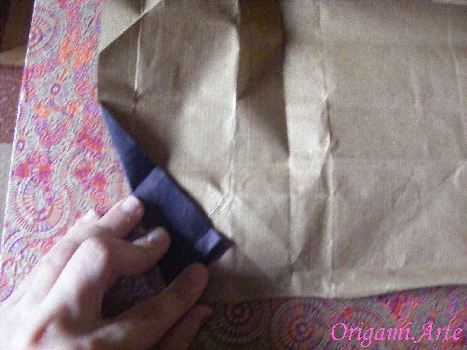 Agora vamos seguir as dobras e formar duas abas. Dobramos a parte superior.